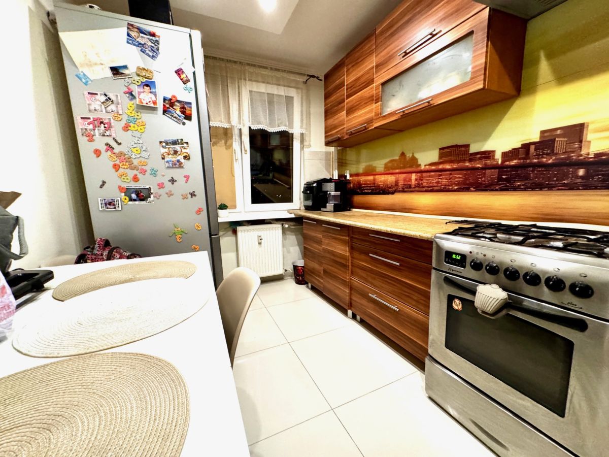 oddzielnej, jasnej kuchni z miejscem na stół i zabudowę kuchenną,