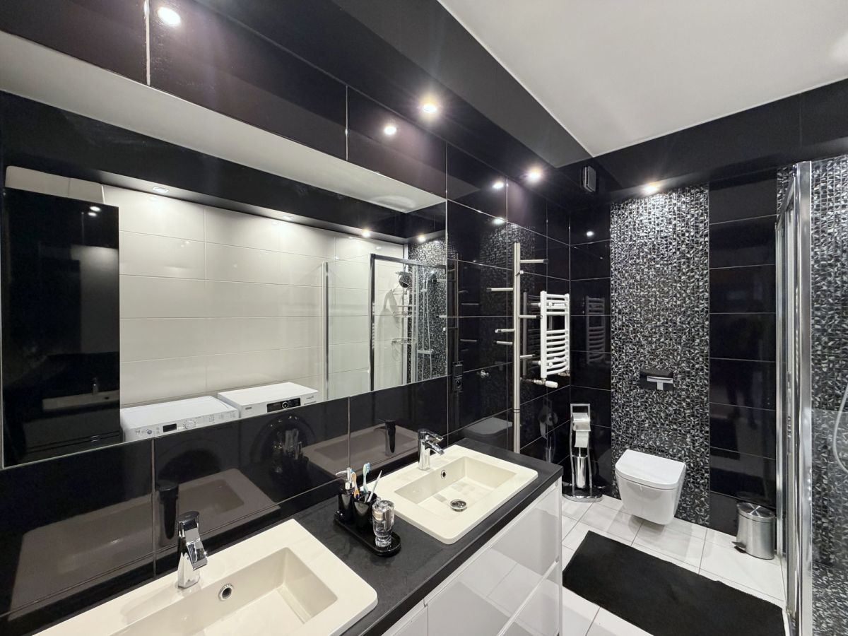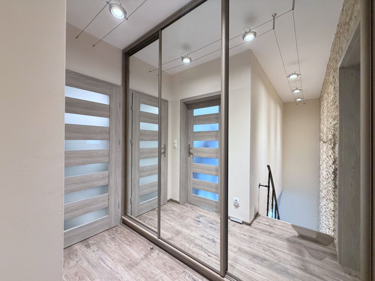 Dwupoziomowy charakter mieszkania zapewnia wyraźny podział przestrzeni, oferując mieszkańcom większą prywatność oraz poczucie przestronności. Dodatkowym atutem jest garderoba dostępna bezpośrednio z sypialni, co zwiększa wygodę codziennego użytkowania.