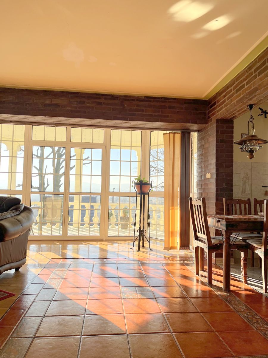 Willa została wzniesiona z najwyższej klasy materiałów – ceramika, ocieplenie styropianem, dachówka ceramiczna. W całości podpiwniczona, z przestronnym salonem z kominkiem, zapleczem biurowym, pralnią, suszarnią, dwiema łazienkami oraz dużymi tarasami z zachwycającym widokiem.